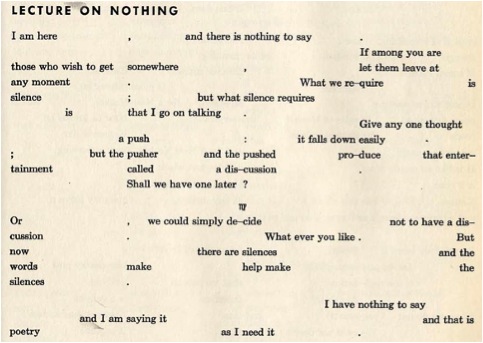 He begins his  Lecture on Nothing: by saying;  “I have nothing to say and I am saying it and that is poetry”