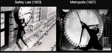 Intertextuality is always a feature of Scorsese movies and the nods to other movies are numerous in Hugo. The scene of the boy dicing with death by clinging to the hands of the railway station clock is obviously inspired by Harold Lloyd’s Safety Last (1923) which Hugo and Isabelle have seen together after sneaking into a cinema.